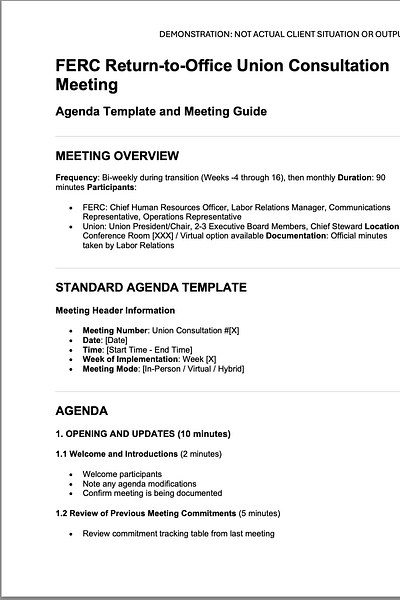 While Claude was doing this, we did other demonstrations of other generative AI tools. The full process took about 45 minutes, but what we found when we returned stunned us. The work is equal to the level of that we would see from someone with at least 10 years of experience in these roles, and the speed was (clearly) super-human. As a result of its web research (and knowing this was a demonstration), Claude selected the Federal Energy Regulatory Commission as the agency and built its approach around that. Claude accounted for very specific FERC details, including the union that represents FERC employees, and the expected added transportation cost for DC-located staff given current cost and transportation statistics. We can’t share all the deliverables here because of their size, but we will share two: the communication strategy and the union meeting guide. We suggest you take a long and careful look at each. Note that the strategy document is 62 pages long.