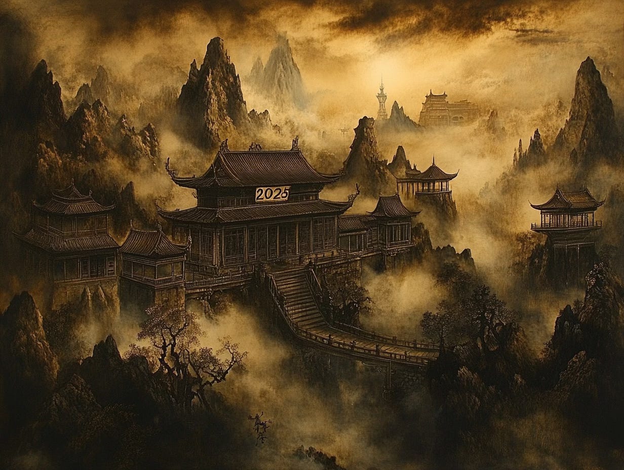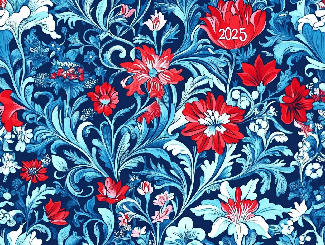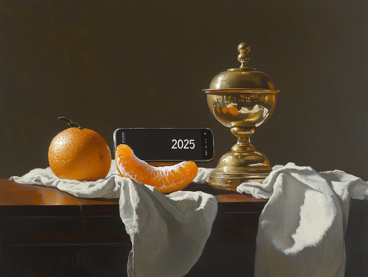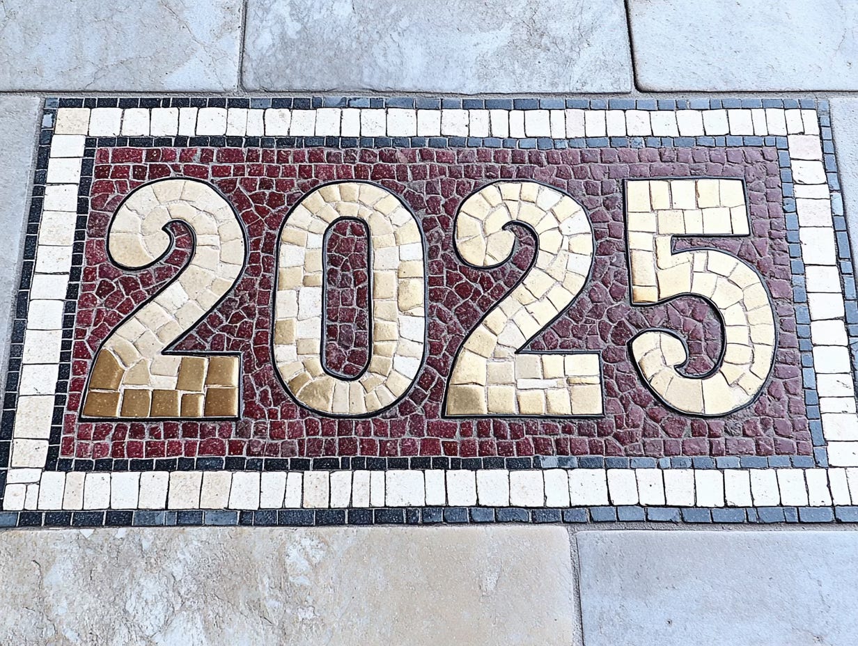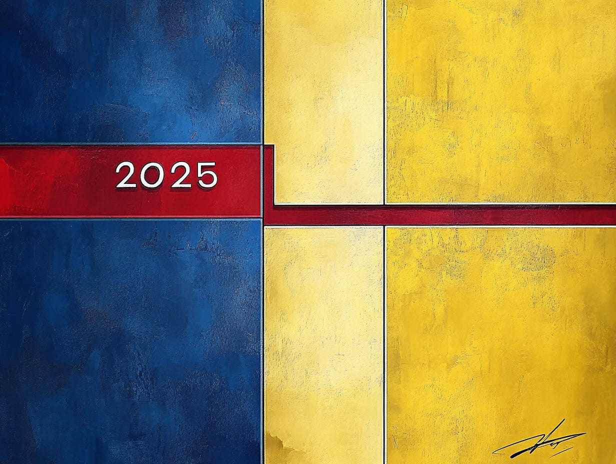 Something that has to do with the new year, includes "2025" in text.It quickly generated 10 concepts with prompts for each, from “Japanese Minimalism Direction: Contemporary Japanese design Approach” to “American Regionalism Direction: 1930s American painting Approach.” We then feed those prompts to Midjourney, which creates four images for each prompt. All told, in about five minutes we have, if we wish, 40 images from which to choose (and we can revise them within Midjourney if we like). We share this because it’s a very practical example of how we’re using generative AI to enable a specific use case in our work. We’re using two tools, one to assist the other, to great effect. We also share it because this week we ran all 10 prompts through Midjourney (usually we just pick one or two). All produced impressive and beautiful imagery. We include one image from each of the 9 prompts we didn’t select for the header, unedited, here.